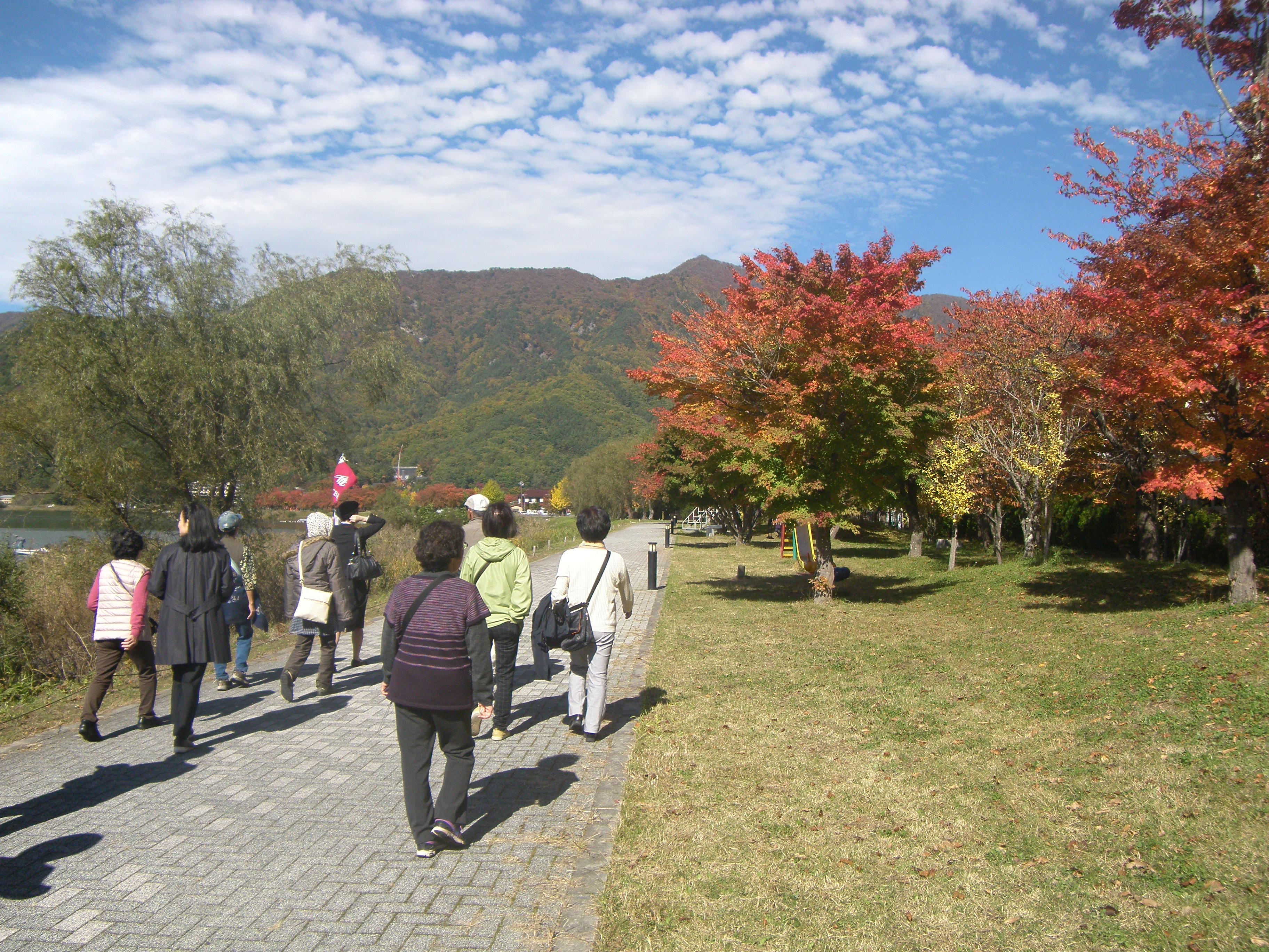 〇1日水曜日は、晴れた暖かい天候のなか、河口湖の湖畔を雄大な富士山と連れだってウォーキングを楽しむとともに、もみじ街道先の、四分ほど色づいたもみじ回廊の紅葉を鑑賞しました。また、午後に訪れた「仙石原すすき草原」も、秋の陽光に黄金色に輝くすすき草原のなかを自由散策しました。